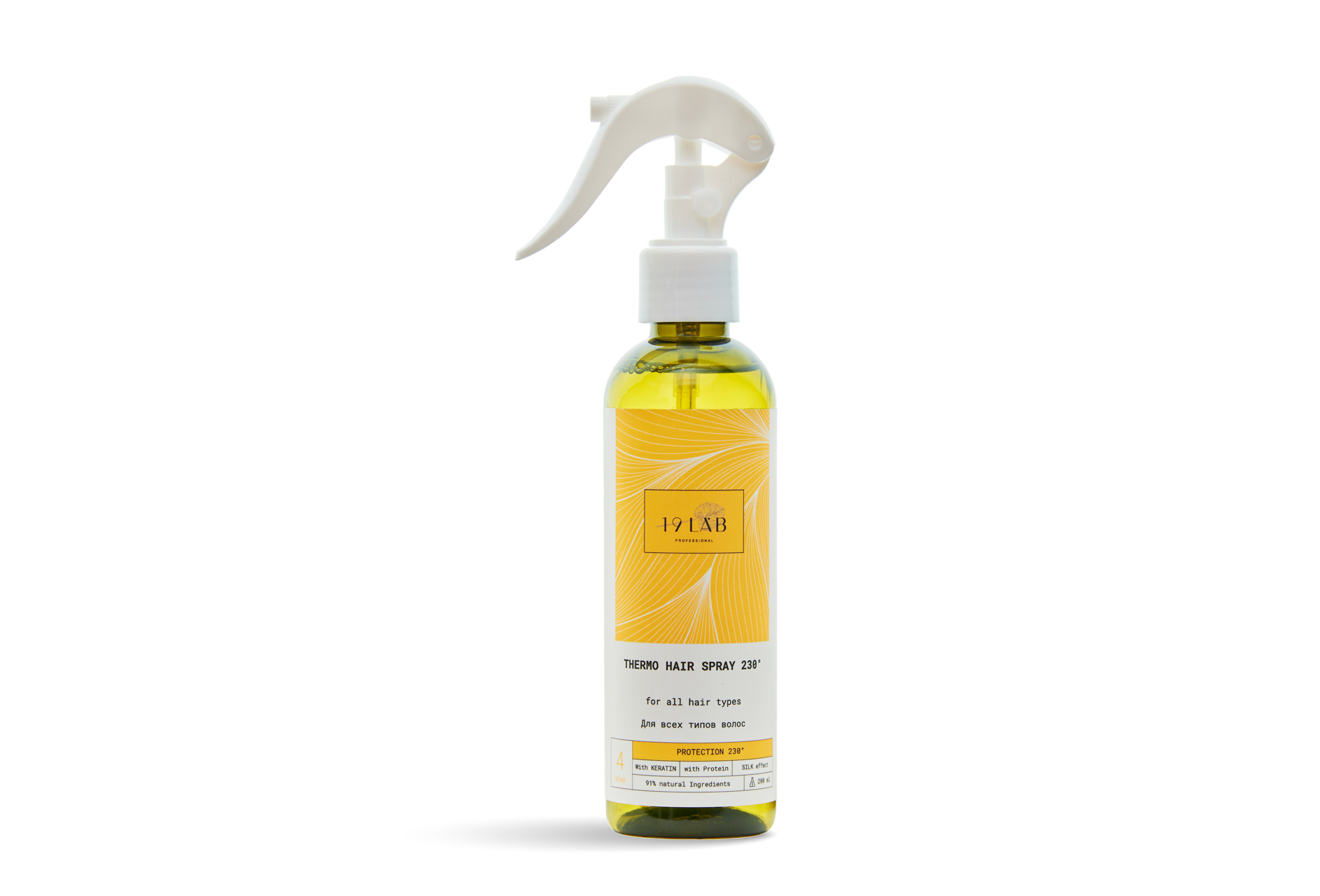 Легкий спрей сохраняет красоту и здоровье ваших волос, обеспечивая им надежную защиту от термического воздействия фена и утюжка. Компоненты в составе увлажняют волосы, делают их более послушными, облегчают расчесывание и последующую укладку. Невидимая пленка бережно окутывает каждый волосок и защищает его от высокой температуры (до 230°C), предупреждая появление ломкости и сеченых кончиков. После использования термоспрея 19LAB вы получаете блестящие и рассыпчатые волосы без эффекта утяжеления. Протеины шелка не позволяют влаге испаряться с поверхности волос, тем самым предупреждая обезвоживание и сухость. Восстанавливают повреждения, снижают статику и делают волосы более эластичными. Кератин укрепляет волосы и защищает их от внешних негативных факторов: UV-излучения, ветра и перепадов температуры. Устраняет пористость и пушистость, превращая волосы в гладкое и струящееся полотно. Подходит для любого типа волос.